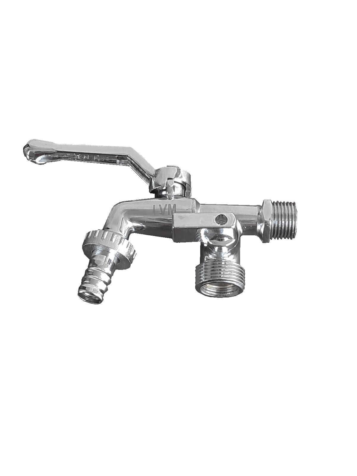 Fabricada em latão com acabamento cromado polido, possui dupla saída padrão 3/4” com fechamento esfera 1/4” de volta;